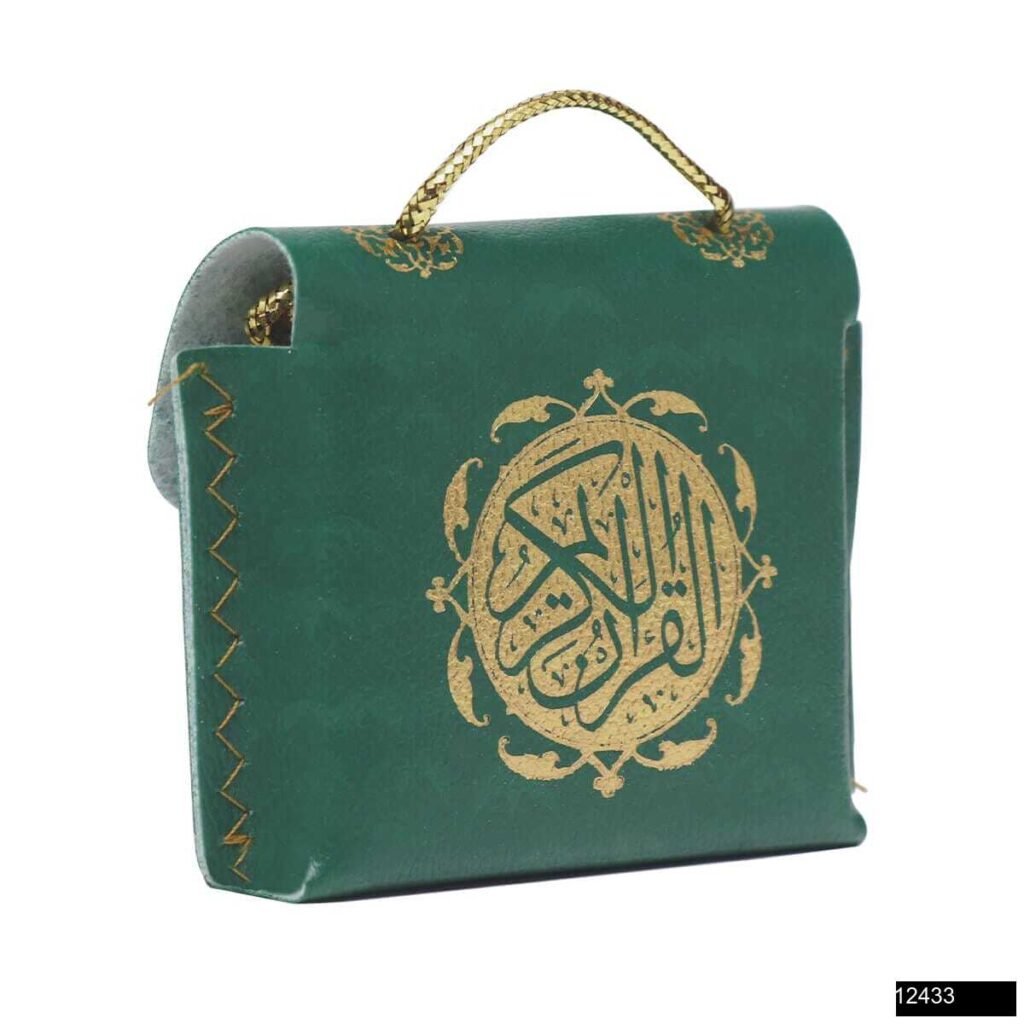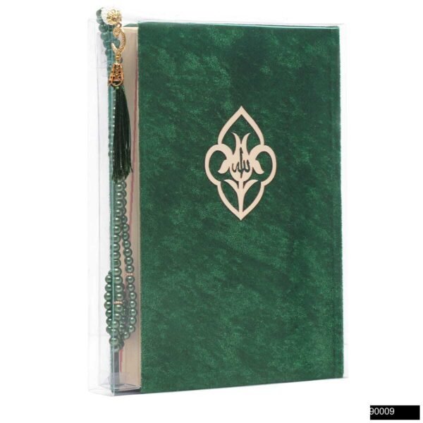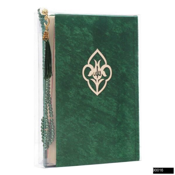 Yeşil Orta Boy Bilgisayar Hatlı Arapça Kadife Kuran + Şeffaf Asetat Kutu + Cam İnci Tesbih Hediye Seti