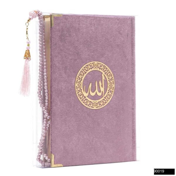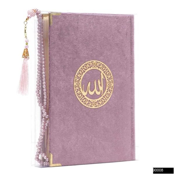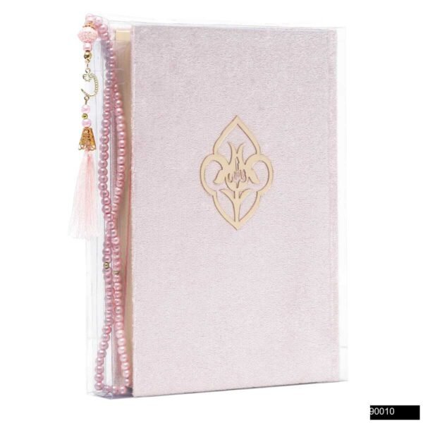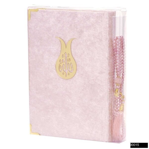 Pembe Çanta Boy Bilgisayar Hatlı Arapça Kadife Kuran + Şeffaf Asetat Kutu + Cam İnci Tesbih Hediye Seti