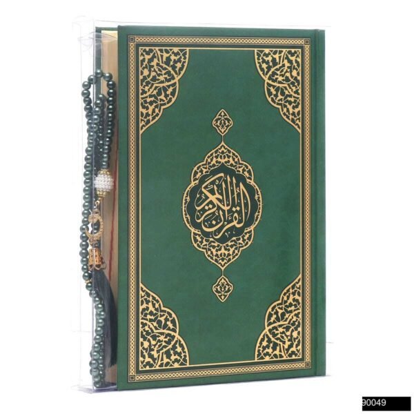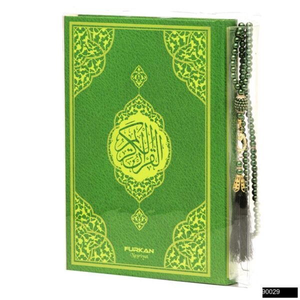 Yeşil Orta Boy Bilgisayar Hatlı Arapça Sıvama Kapak Kuran-ı Kerim + Cam İnci Tesbih + Asetat Kutu Hediye Seti