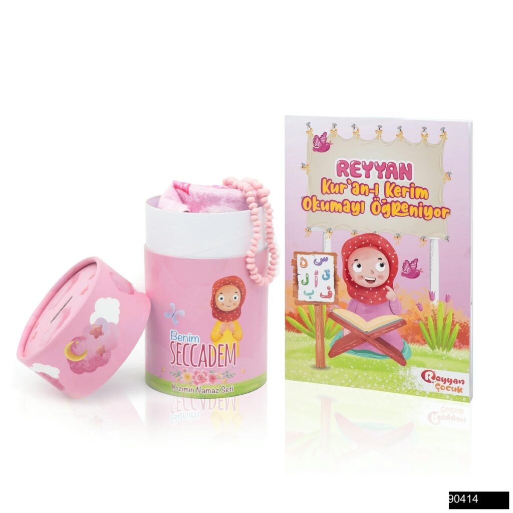 Yeşil Reyyan Çocuk – Kuran-Kerim Okumayı Öğreniyorum Elif-Ba + Furkan Neşriyat Çocuk Serisi Kumbaralı Silindir Kutu Türkçe + Reyyan Çocuk – Seccade + Gül Kokulu Tesbih