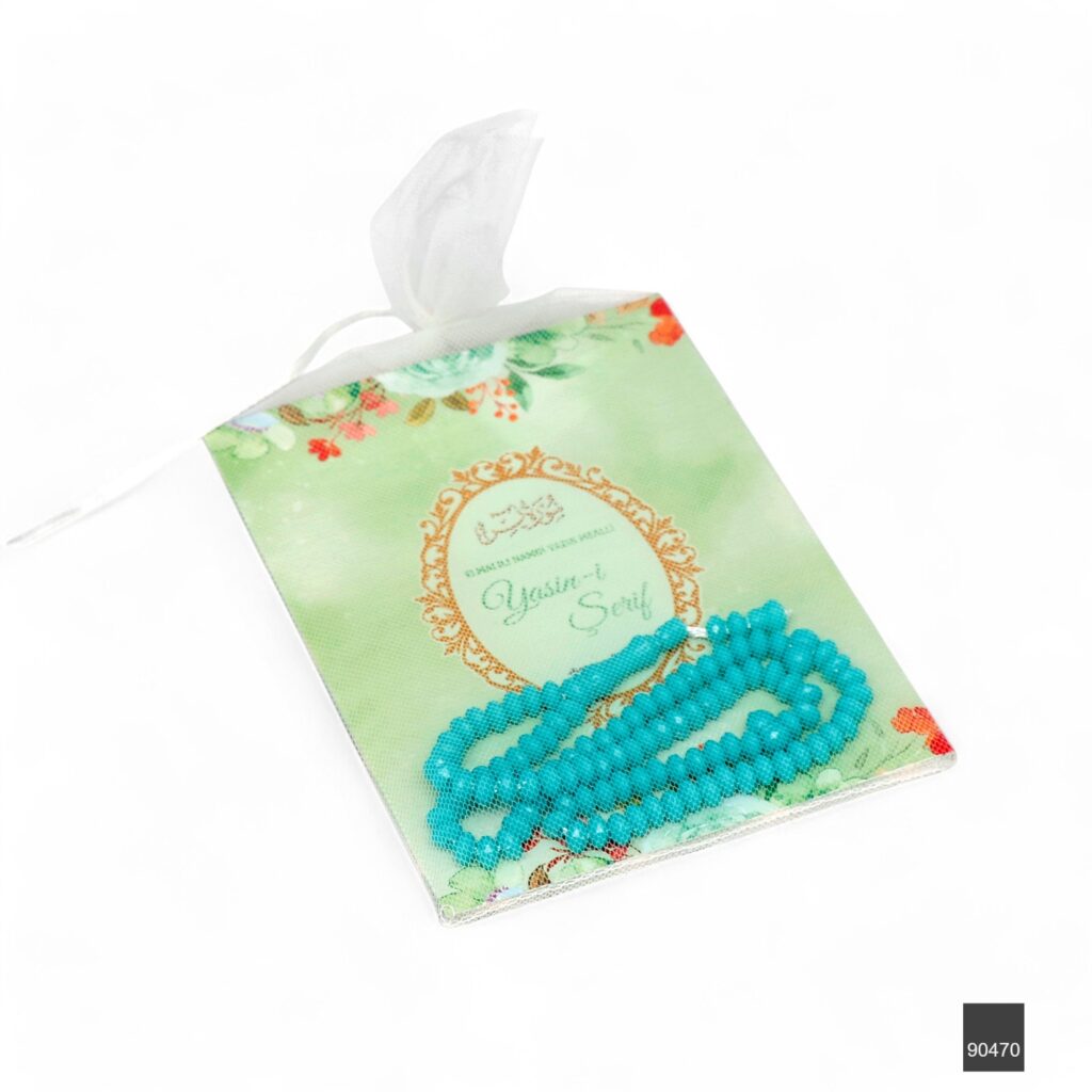 Su Yeşili Lalezar 128 Sayfa Şamua Çanta Boy Yasin + Cam İnci Tesbih + Tül Kese Hediye Seti
